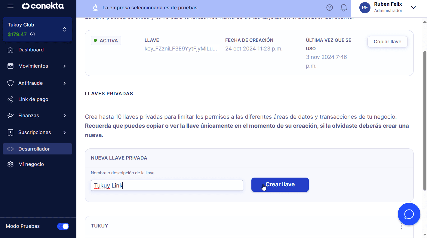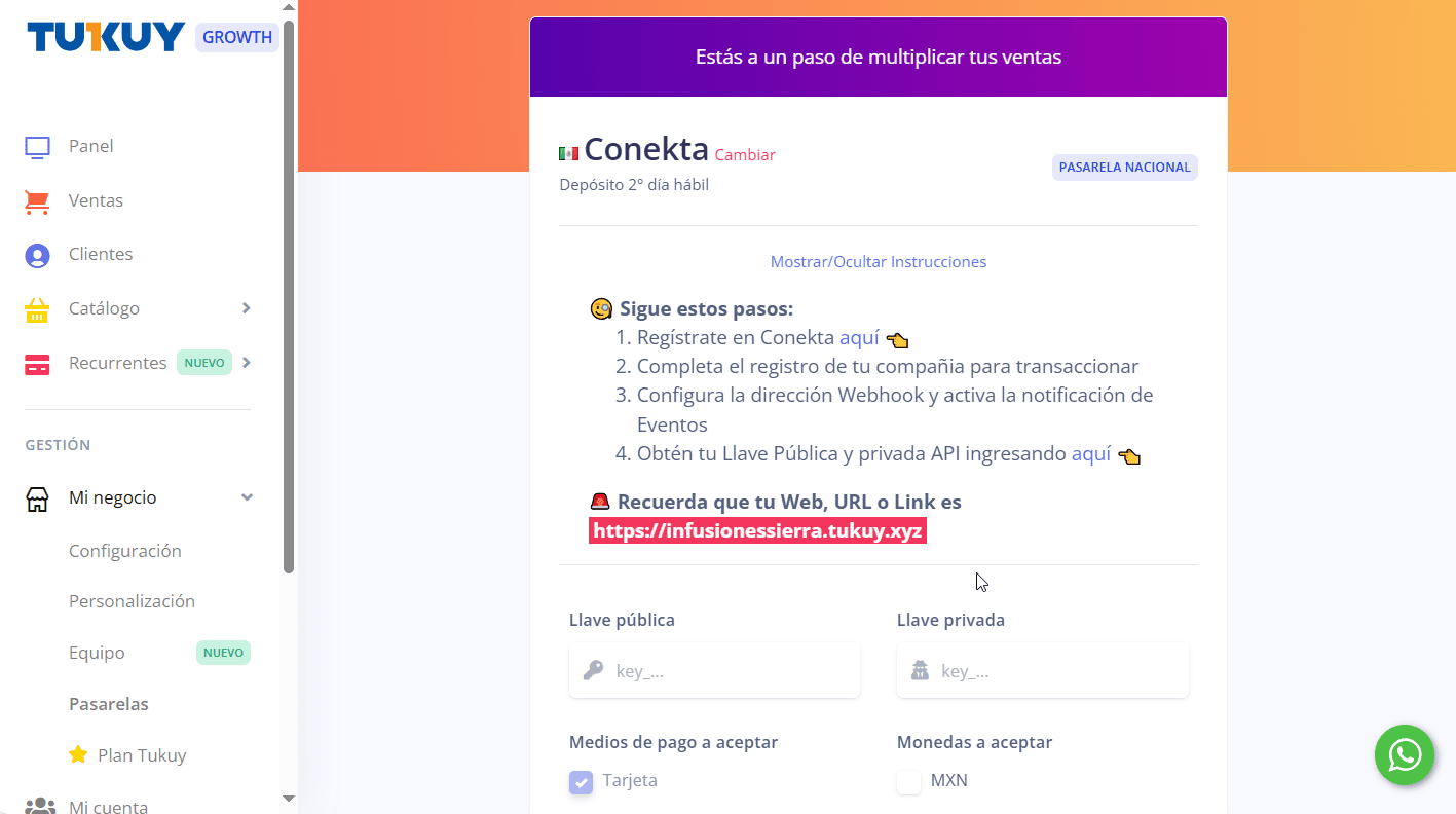 4. Ahora ya puedes ingresar tus llaves en Tukuy para concretar la integración de tu Link Tukuy con la pasarela de pagos Conekta.