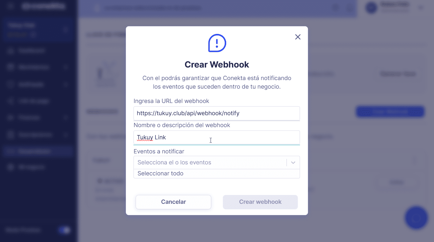 . Como nombre o descripción del webhook puedes colocar, neuvamente, “Tukuy Link”, y en el apartado de Eventos a Notificar asegúrate de marcar la casilla: