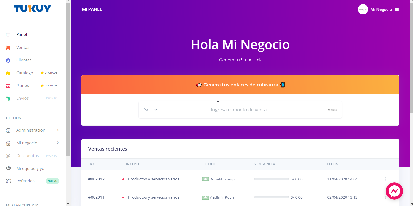 Registrate gratis en Tukuy, obtén tu link personalizado, y compártelo con todos tus clientes solo poniendo el monto a cobrar al final de tu enlace.